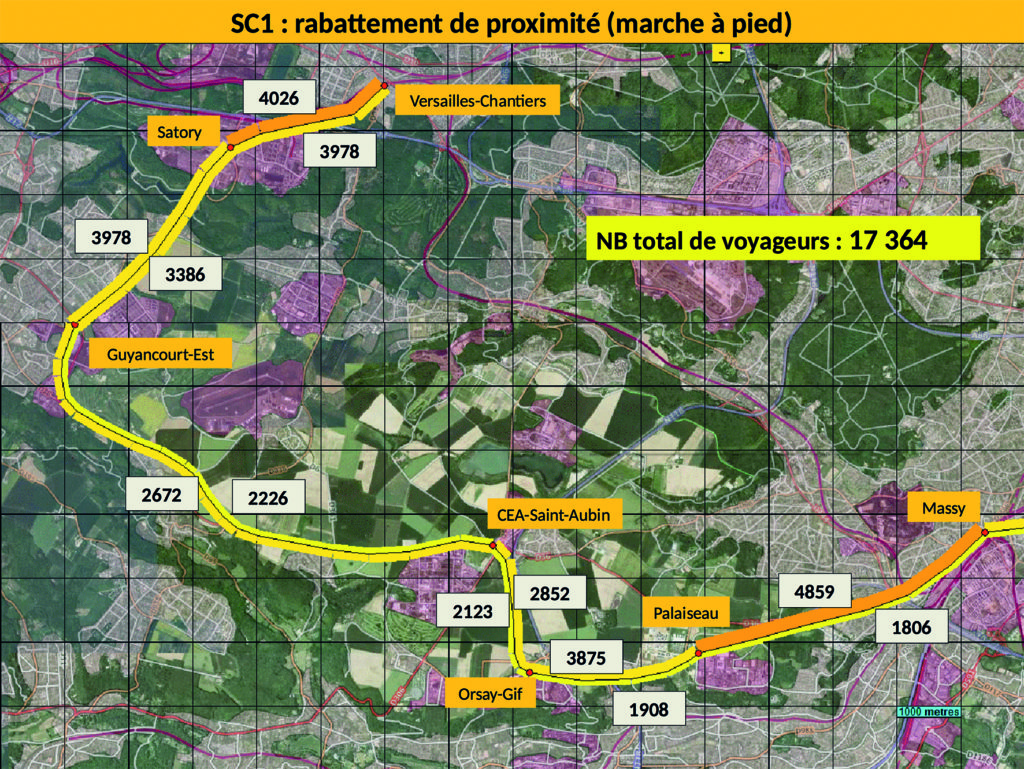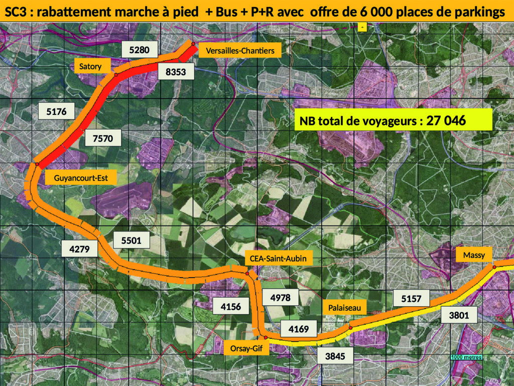Les résultats de la RATP et d’Ile-de-France Mobilités sont très différents. Dans le sens Versailles – Massy, pour la RATP la ligne se charge de 800 voyageurs, alors que pour Ile-de-France Mobilités, elle se charge autant qu’elle se décharge. Dans le sens Massy – Versailles, pour la RATP, la ligne se décharge de 100 voyageurs, tandis que pour Ile-de-France Mobilités elle se décharge de 200 voyageurs. Nous savons que dans un rayon d’un peu plus de 1 km autour de la station, se trouvent les 6 000 emplois du CEA de Saclay et quelque 300 emplois au Christ de Saclay. Et on peut évaluer autour de 1 000 la population active voisine de Saint-Aubin, de Villiers-le-Bâcle et du Christ-de-Saclay. La ligne doit donc fortement se décharger au passage de cette station. La prévision de la RATP peut être qualifiée d’invraisemblable. Celle d’Ile-de-France Mobilités réduit l’écart à la réalité.