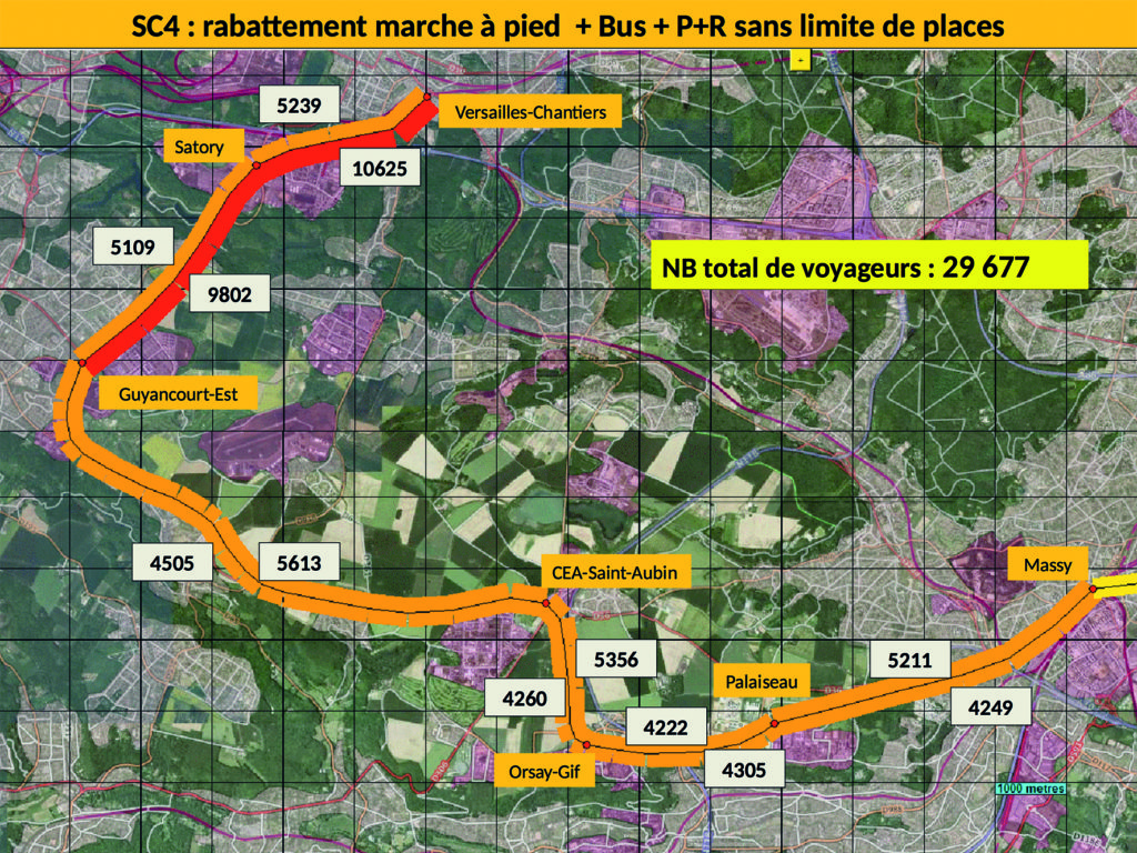 Les quatre graphiques ci-dessus diffèrent par les modalités de rabattement sur la ligne 18, présentées sous forme de quatre scénarios. Dans le premier (SC1), le rabattement se fait uniquement en marche à pied, ce qui constitue une hypothèse très minimaliste. Dans le second (SC2), il se fait grâce à un réseau de bus restructuré ; dans le troisième (SC3), il s’y rajoute une offre de 6 000 places de parkings-relais. Ces deux scénarios SC2 et SC3 sont ceux qui vont encadrer au mieux la réalité. Le quatrième (SC4) fournit une hypothèse maximaliste, dans laquelle le stationnement serait possible sans limite dans les parkings-relais de la ligne : il faudrait pour le réaliser une offre de près de 11 000 places de parkings.