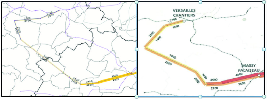 Le graphique ci-dessous à gauche représente le « serpent de charge » de la ligne 18 du métro du Grand Paris Express sur le plateau de Saclay, tel qu’il a été initialement produit par la RATP par utilisation du modèle « Global » pour dimensionner la ligne à l’heure de pointe du matin. Le graphique de droite présente le même « serpent de charge » obtenu par le modèle Antonin d’Ile-de-France Mobilités (anciennement Stif).