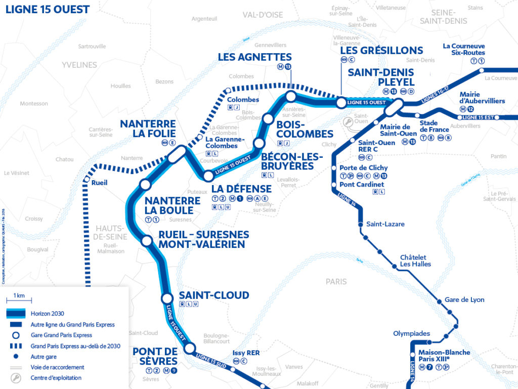 Les usagers de l’AUT IDF regrettent vivement le report de la 15 Ouest. Pour deux raisons. La première vaut aussi pour la 15 Est : boucler la boucle de la 15 est ce qui permet le mieux de désaturer l’ensemble du métro parisien. C’était d’ailleurs l’un des objectifs du projet Métrophérique de la RATP dont, à l’issue d’une histoire compliquée, la ligne 15 reprend pour l’essentiel le tracé. Deuxième raison, c’est à l’ouest que les besoins sont le plus importants. 600 000 voyageurs/jour attendus : c’est deux fois plus que la 15 Sud. La 15 Ouest passe par la Défense. Quand on a dit ça, vu la structure de l’emploi en Ile-de-France, on a à peu près tout dit.