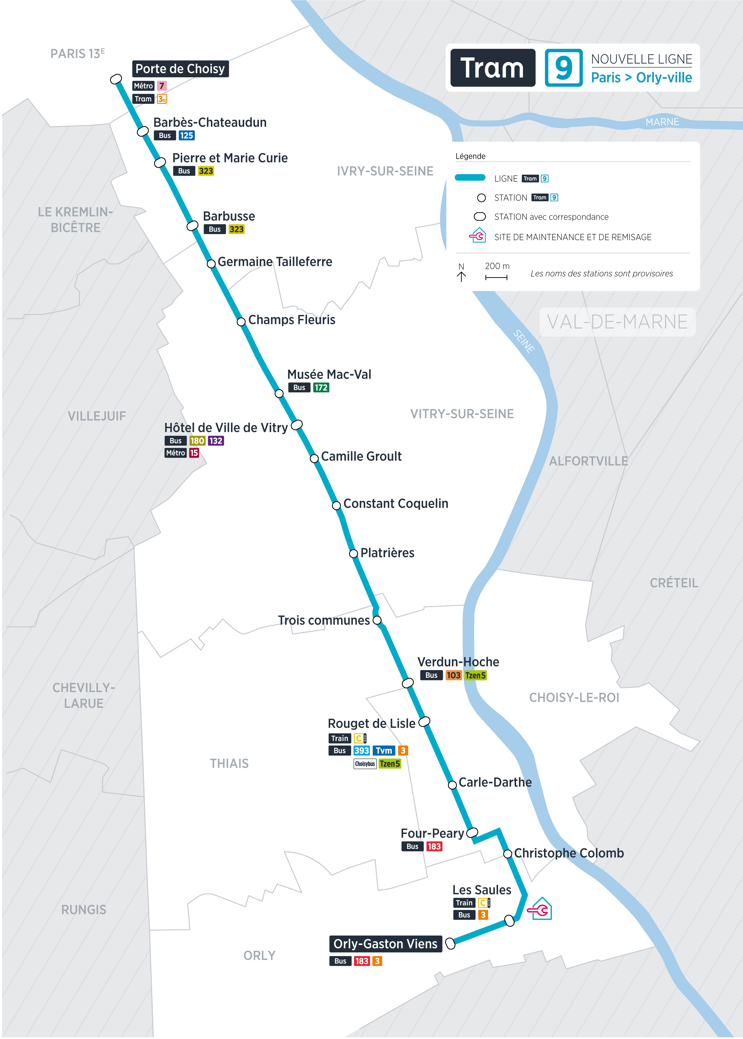 La ligne de tramway T9, actuellement en travaux, reliera Paris (Porte-de-Choisy) au centre-ville d’Orly en 30 minutes en desservant sur son tracé les villes d’Ivry-sur-Seine, de Vitry-sur-Seine, de Choisy-le-Roi et de Thiais. D’une longueur de 10 km, elle offrira aux habitants des communes traversées un mode de transport plus capacitaire, plus confortable et plus écologique que les bus actuellement en circulation. La première rame est attendue à la fin de l’année.