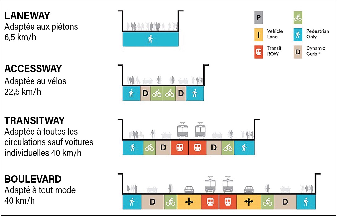 Résulte de ces principes une distinction entre les laneways (passages) où l’on va tout au plus à 4 miles/h (6,4 km/h) et qui sont réservés aux piétons tandis que les accesways seraient réservés à 14 miles/h (22,5 km/h) pour les vélos et pourquoi pas les trottinettes. Des transitways, plus larges encore, acceptent tous les modes de déplacement sauf les voitures individuelles, les transports publics y ont la priorité et les flux y sont physiquement séparés. Enfin, des boulevards, limités à 25 miles /h (40,2 km/h), acceptent les automobiles. Dans les voies les plus larges, les piétons restent sur les côtés de la rue. Les LED dans le revêtement indiquent les modifications dans le nombre où la largeur des voies, voire dans le sens de leur utilisation.