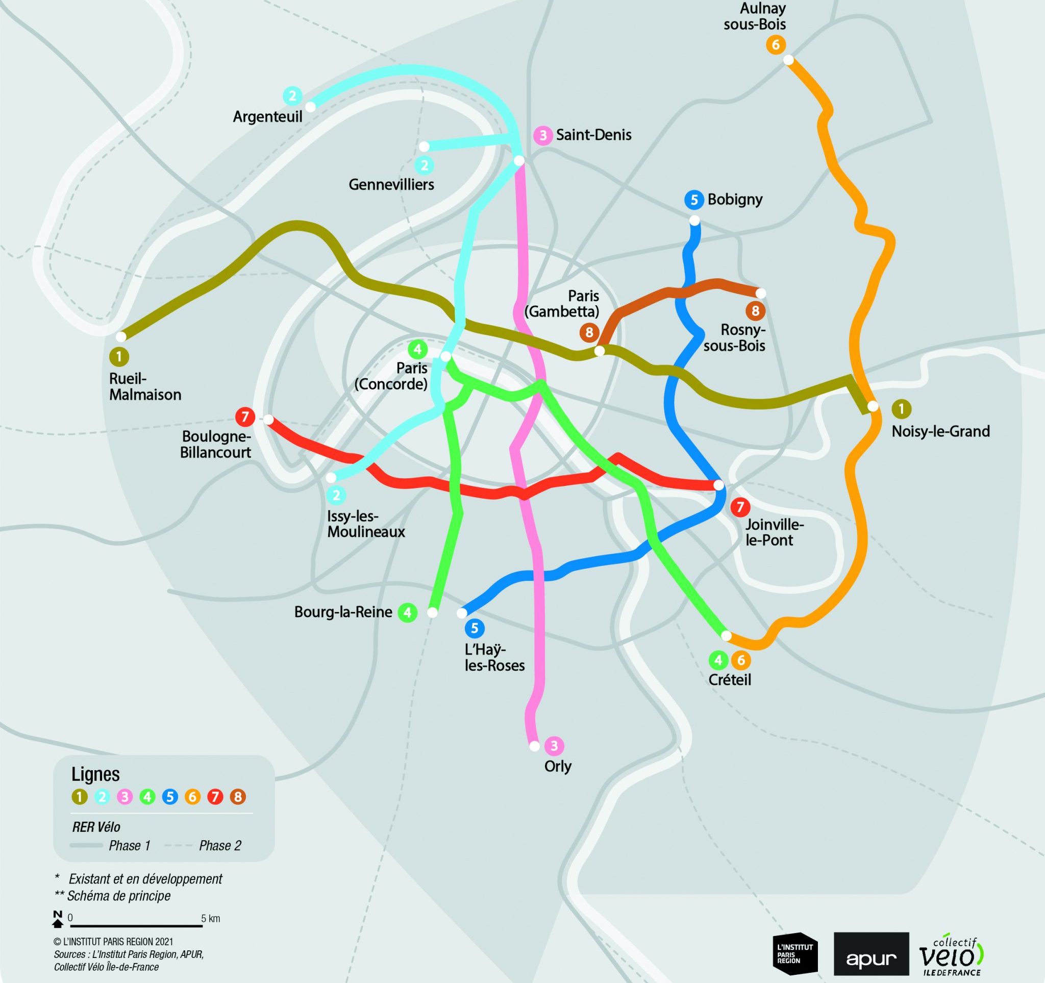 L’objectif, explique-t-elle, consiste à « définir un réseau cyclable structurant à l’échelle métropolitaine, en complémentarité des réseaux RER V et en lien avec les différents gestionnaires d’infrastructures concernés par les propositions de la Métropole« . Concrètement, 8 lignes structurantes sont envisagées, desservant 65 communes (soit la moitié des communes du territoire et près de 75 % de la population) sur près de 200 km. La ligne 1 par exemple ira de Rueil-Malmaison à Noisy-le-Sec en 30 km. La 4 reliera Bourg-la-Reine à Créteil en passant par le centre de Paris en près de 30 km.