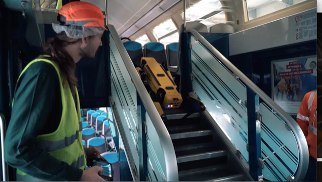 Ils souhaitaient vérifier si le robot Spot, prêté par le distributeur Génération Robots, était capable de circuler dans ces rames Transilien à deux niveaux afin d’y effectuer des missions de désinfection et de contrôle de présence de voyageurs en bout de ligne, avant d’envoyer une rame au remisage.