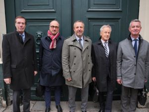 Ci-contre : les représentants de l’Alliance 4F et du transport combiné rail-route reçus par le ministre. De gauche à droite : Frédéric Delorme (Fret SNCF), Raphael Doutrebente (Europorte), Franck Tuffereau (AFRA), Ivan Stempezynski (GNTC) et Alexandre Gallo (DB Cargo France).