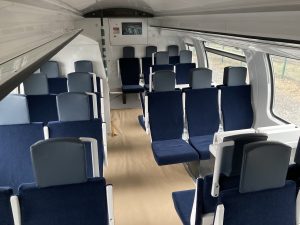 Mais par rapport aux 104 voitures Corail qu’il va remplacer (et que nombre de voyageurs diront regretter pour leur roulement ou leur volume intérieur), le nouveau matériel offrira indéniablement des nouveautés. A commencer par l’accès de plain-pied, qu’apprécieront en particulier les voyageurs encombrés de bagages ou à mobilité réduite, avec de larges portes à comble-lacune à déploiement automatique. Et l’aménagement présente 463 places assises par rame, avec espace pour deux voyageurs en fauteuil roulant, ce qui permettra à une unité double d’accueillir 25 % de voyageurs assis en plus que sur les compositions de voitures Corail en service au nord de Paris. Une fois à bord, les voyageurs pourront se répartir entre les voitures à un ou deux niveaux, via des intercirculations quasi-imperceptibles par rapport aux bruyants soufflets entre voitures Corail. Les cyclistes apprécieront les emplacements pour un total de 12 vélos, alors que de grands racks à bagages devraient éviter de trop encombrer les passages, les week-ends ou lors des départs en vacances (mais pas sûr que le volume des portes-bagages au-dessus des sièges des voitures Corail soit intégralement retrouvé…). Et question confort moderne, la climatisation sera complétée par un plancher chauffant et des systèmes d’information sur écrans.