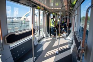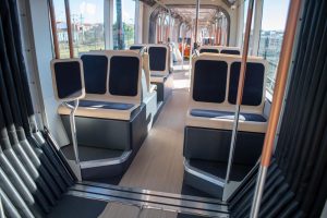 C’est l’agence tourangelle RCP design global, sélectionnée par la ville de Nantes pour concevoir ses futurs véhicules de tramway, qui a accompagné la métropole sur son design. Tout comme à Tours, RCP a défini le code de conception des arrêts du tramway nantais, ainsi que le design intérieur et extérieur des futurs véhicules avant la production de ces derniers par Alstom selon la conception et les recommandations de l’agence. « Nous avons repensé le parcours urbain en travaillant avec 39 habitants du quartier pour créer un tramway qui s’inscrit dans le paysage réel, imaginaire et symbolique de la ville pour mieux desservir les personnes vivant et cohabitant à Nantes », explique Régine Charvet Pello, PDG de RCP design global. Les attentes du panel d’habitants quant aux aspects intérieurs et extérieurs, mais aussi aux fonctionnalités, à l’ambiance lumineuse, aux couleurs ou aux matières, aux formes du mobilier ou encore à l’information voyageurs ont été analysées, précise l’agence. En particulier, près de 40 % des côtés du tramway sont vitrés « pour permettre une meilleure transparence de l’extérieur, une luminosité accrue à l’intérieur et un voyage plus agréable pour les passagers ». Les recherches ont également porté sur une plus grande facilité d’identification des huit accès par côté, dotés de portes à deux vantaux, notamment pour les personnes à mobilité réduite (lacunes réduites, appels d’urgence) ou malvoyantes (clignotants lumineux lors des ouvertures et fermetures), « mais aussi adaptées aux conséquences de la crise sanitaire ».