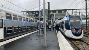 C’est enfin l’arrivée à Massy-Palaiseau, côté SNCF, par un plan de voie complexe qui permet de garer le tram-train sur le même quai que les rames à deux niveaux de la ligne V, qui remplace depuis le 4 décembre le RER C sur la Grande Ceinture jusqu’à Versailles-Chantiers. Cette situation est-elle appelée à se perpétuer, alors qu’il était prévu à l’origine de faire arriver le T12 à Versailles ? Toujours est-il que la fréquence des trams-trains exploités par Transkeo T12-T13, qui doit prochainement atteindre un passage toutes les 10 minutes aux heures de pointe, serait trop élevée pour les nombreux passages à niveau de la nouvelle ligne V (sur cette dernière, la fréquence maximale sera moins élevée, tous les quarts d’heure en pointe). Quoiqu’il en soit, les trams-trains iront quand même à l’ouest de Massy-Palaiseau… mais pour quelques centaines de mètres seulement, afin de gagner le nouvel atelier-garage du T12.