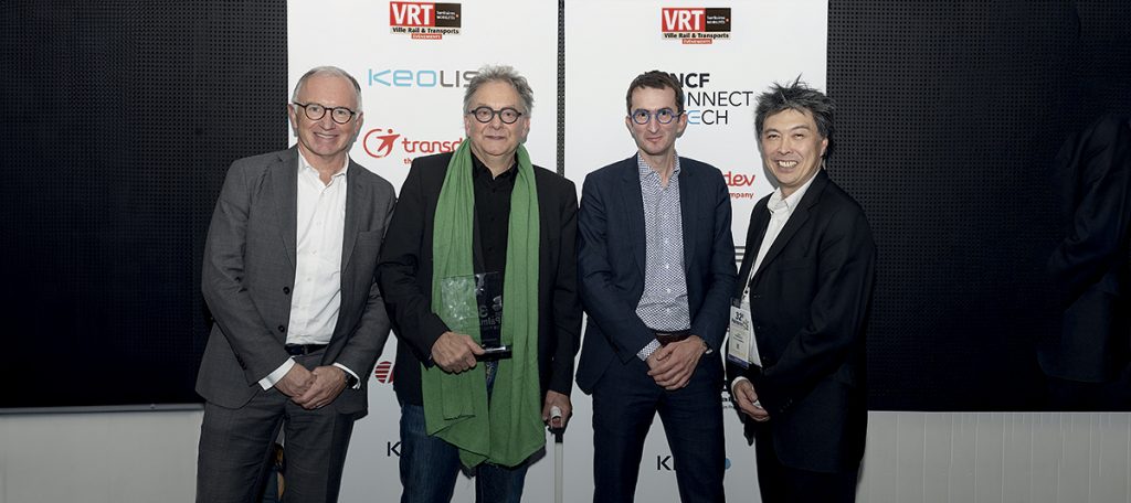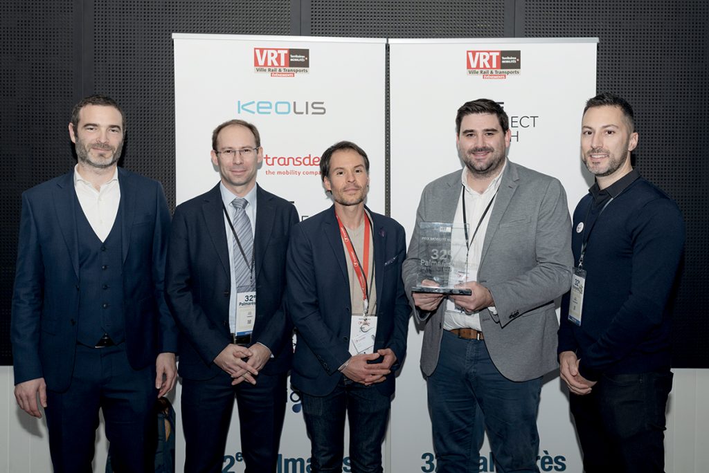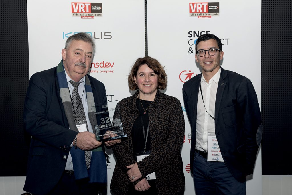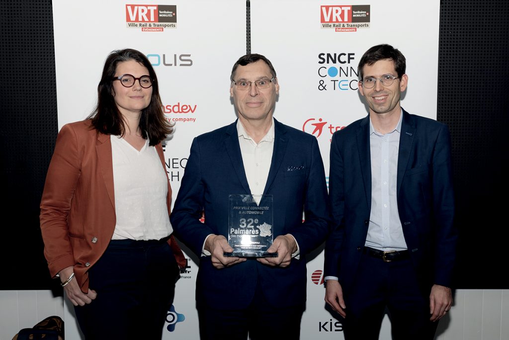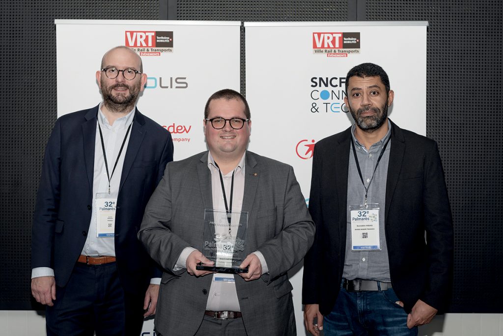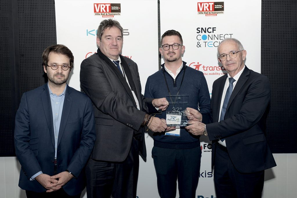 Remettant : Arnaud Coiffard, directeur Stratégie, innovation et nouveaux marchés, SNCF Connect & Tech. Pierre-Marie Cailleau, vice-président Mobilités de la Communauté d’agglomération du Choletais. Marc Delayer, directeur général, Transports publics du Choletais. Romuald Poupard, conducteur.