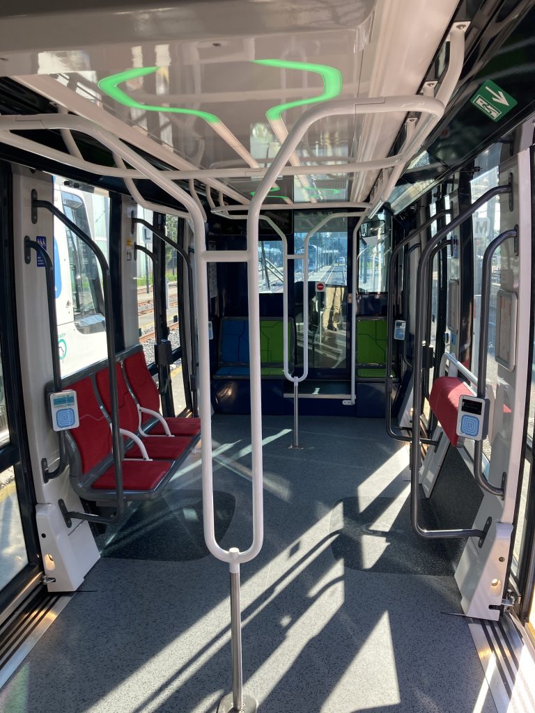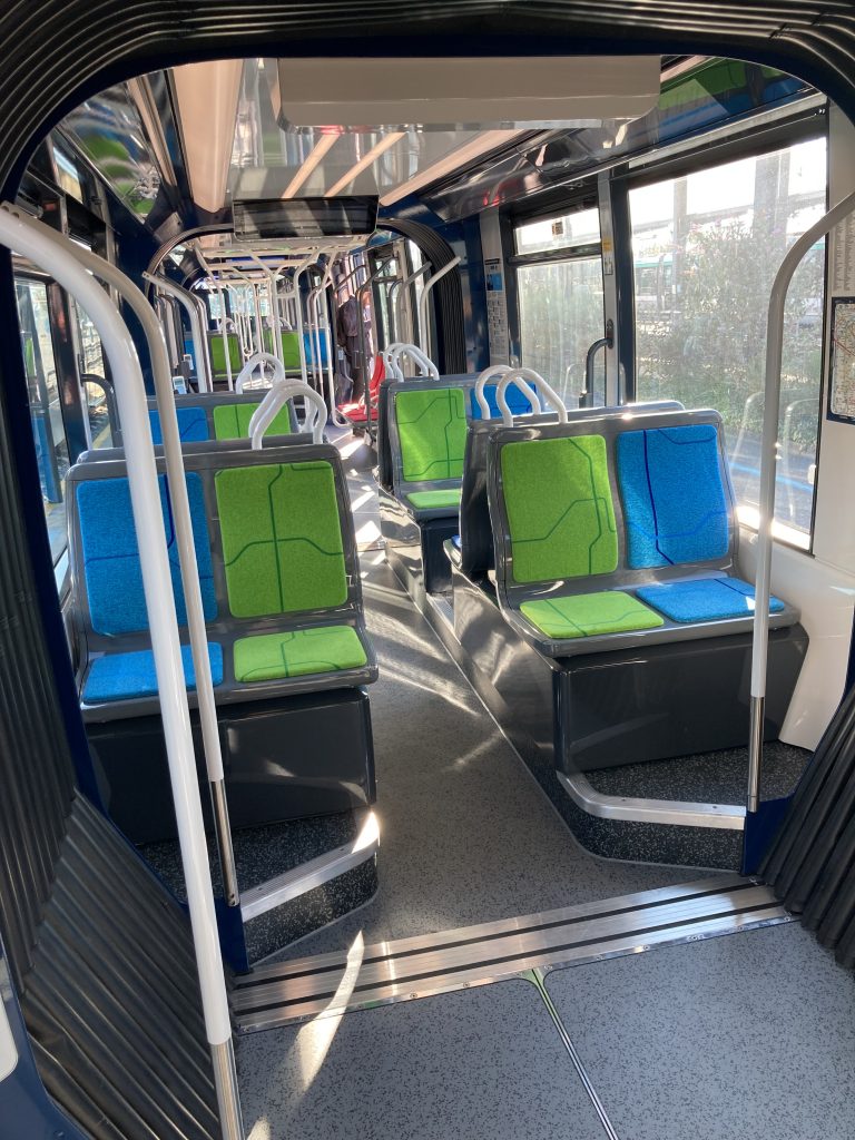 A l’intérieur de nouvelles couleurs de sièges (vert et bleu foncé) apportent une variété bienvenue à la palette de couleurs. Au sol, deux nuances de gris distinguent les espaces où l’on stationne de ceux où l’on circule, alors que la visibilité par contraste des barres de préhension a fait l’objet de soins poussés. Comme tout matériel actuel, le TW20 est doté d’une climatisation, d’une vidéoprotection, d’un éclairage par LED (avec indication du côté de la sortie) et de ports USB répartis le long de chaque rame. Et pour plus de silence, les caisses d’extrémité reposent sur des bogies du type Magdebourg (développés en Allemagne pour les trams de cette ville au milieu des années 1990), pivotants et non motorisés.