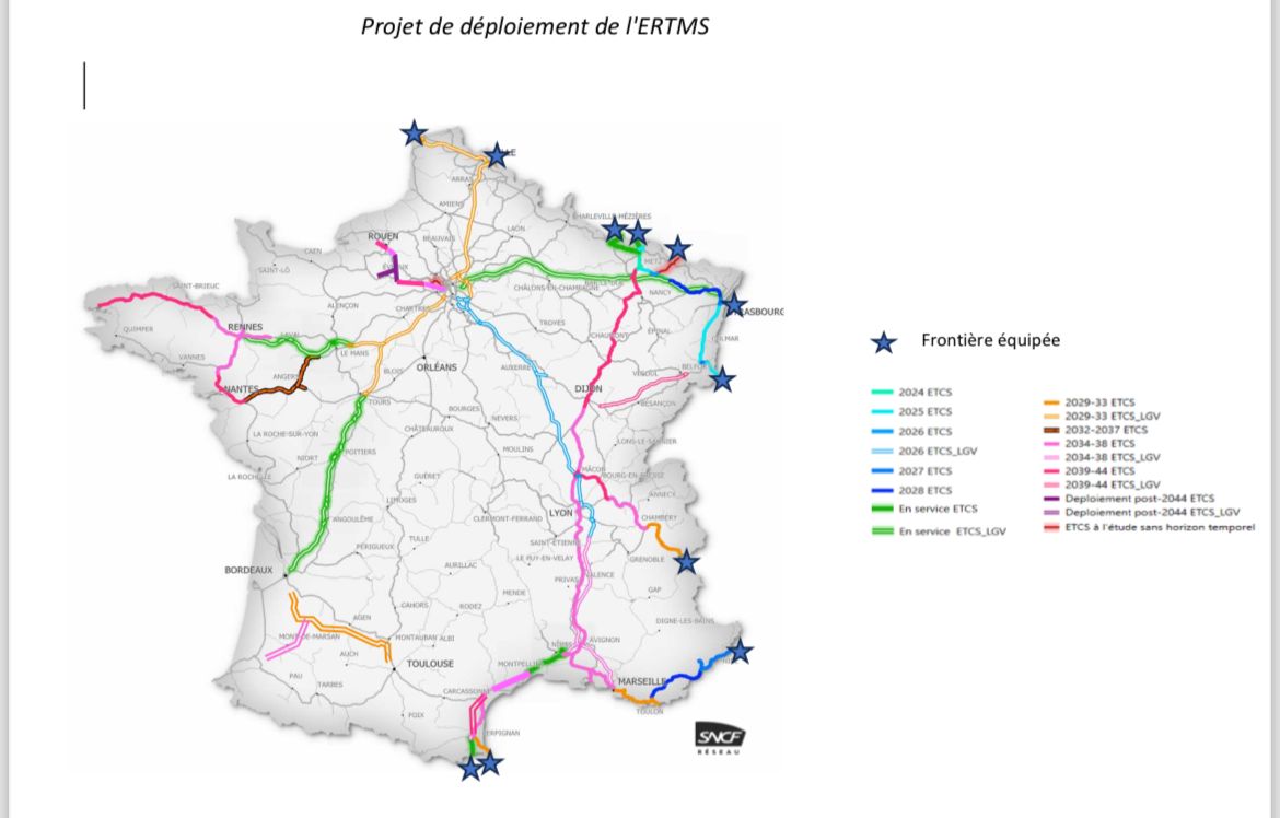 C’est pourquoi la Commission européenne demande aux gouvernements d’accélérer son déploiement.Or la France est en retard. Aujourd’hui, seules les trois LGV inaugurées en 2017 (LGV Est, Tours-Bordeaux, Bretagne) ont été conçues en intégrant l’ERTMS. Et des travaux sont donc en cours sur la LGV Sud Est et sur la ligne Marseille-Vintimille qui devrait connaître vers 2027 le même type d’opération que celui mis en oeuvre en novembre sur la LGV Paris-Lyon.
