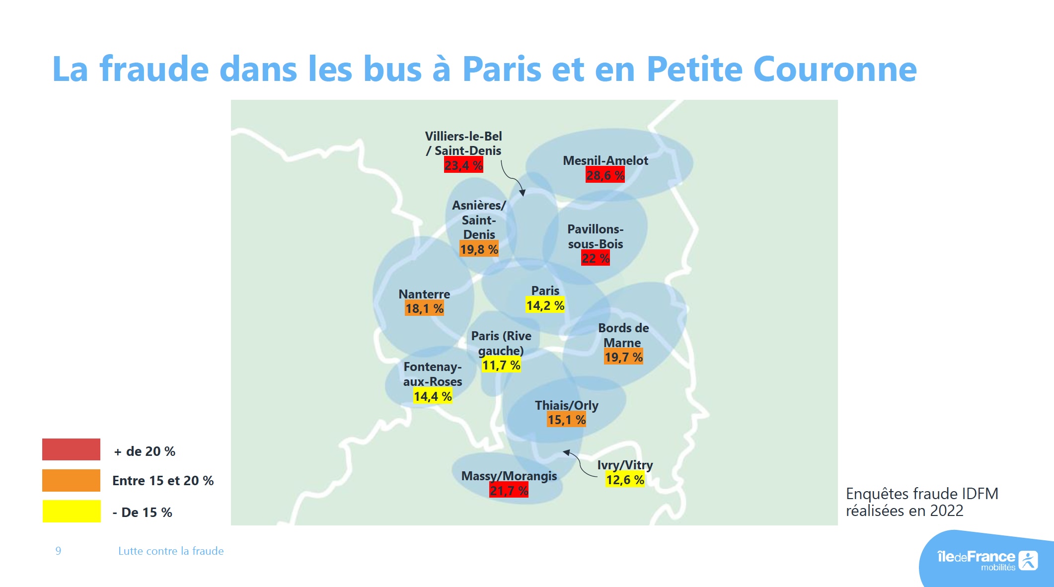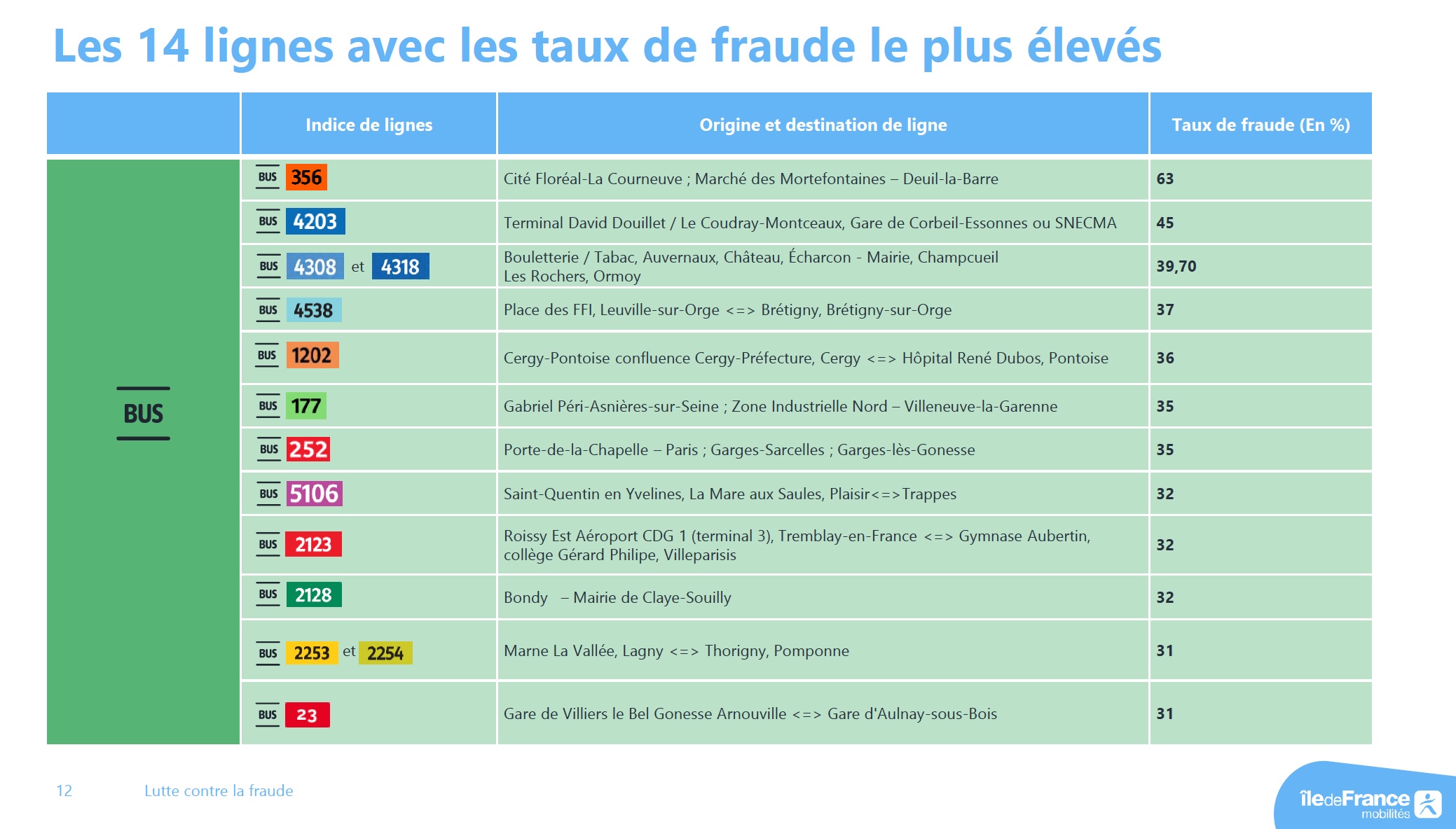 Dans Paris intramuros et en petite couronne, à bord des bus de la RATP, elle s’établit à 14%, pour atteindre presque 30% dans le secteur du Mesnil-Amelot, au nord-Est de Paris. En grande couronne, le palmarès revient aux lignes de bus autour de Roissy, de l’axe Est-Seine-Saint-Denis, d’Evry, Melun, Sénart, Sainte-Geneviève de Bois, Brétigny, Juvisy etc. Mais globalement, en grande couronne « ça s’améliore », estime Valérie Pécresse qui attribue cette tendance à l’ouverture à la concurrence du réseau Optile. En moyenne un an après le début d’un contrat de délégation de service public, la fraude passe de 12,7% à 11,5%. « Chaque opérateur a la responsabilité de lutter contre la fraude sur ses lignes et il est rémunéré à la validation », souligne IDFM. Ce qui n’est pas encore le cas sur le réseau de bus de la petite couronne, opéré par la RATP, où l’ouverture à la concurrence a commencé et des appels d’offres sont en cours.