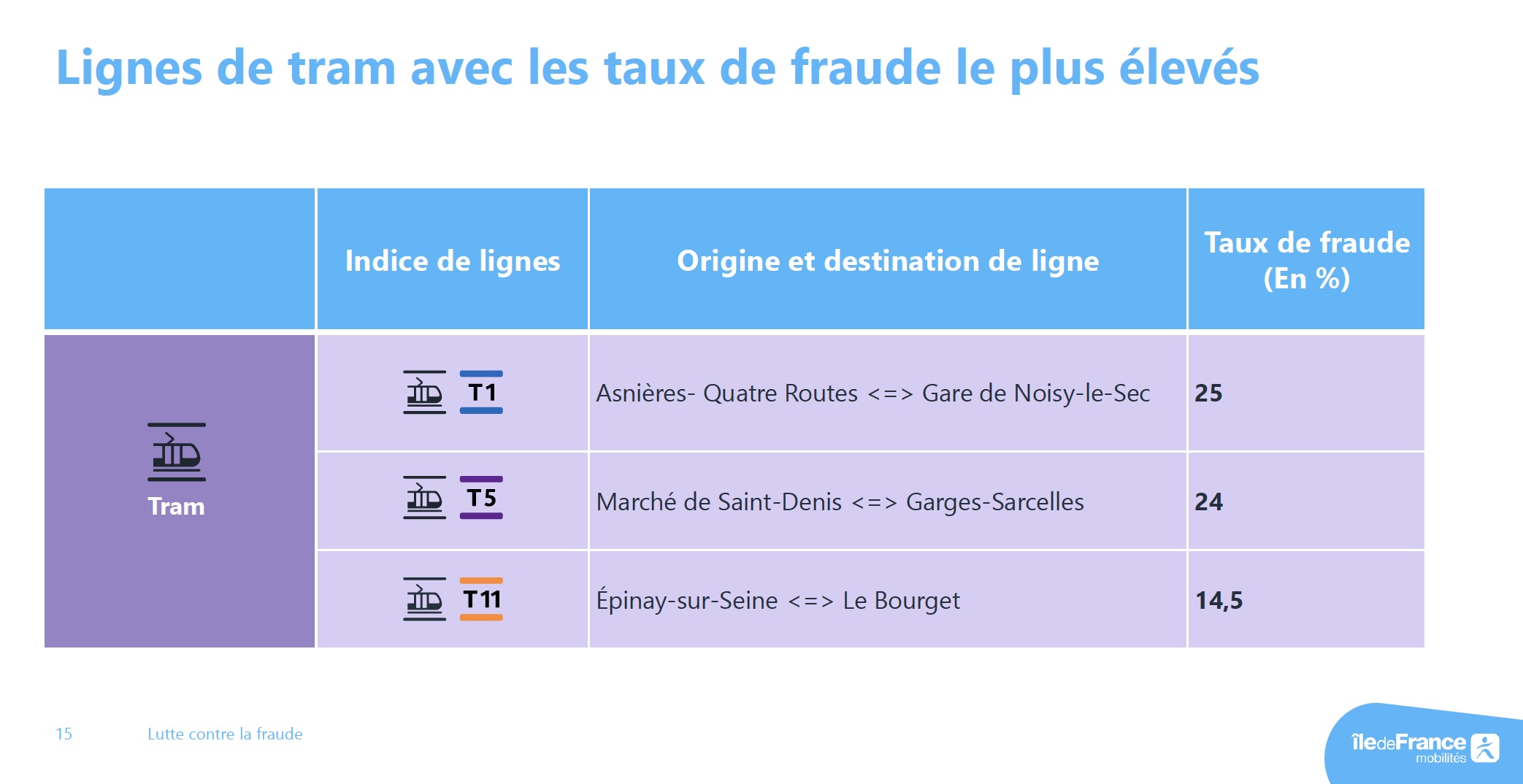 Dans les tramways de la RATP, la fraude est à 16%, 11% dans les trams-trains opérés par la SNCF. Dans les Transilien, elle est à 9,5%, avec des pointes à plus de 12% sur les RER B et D, et la ligne H qui dessert le nord-ouest de l’Ile-de-France.
