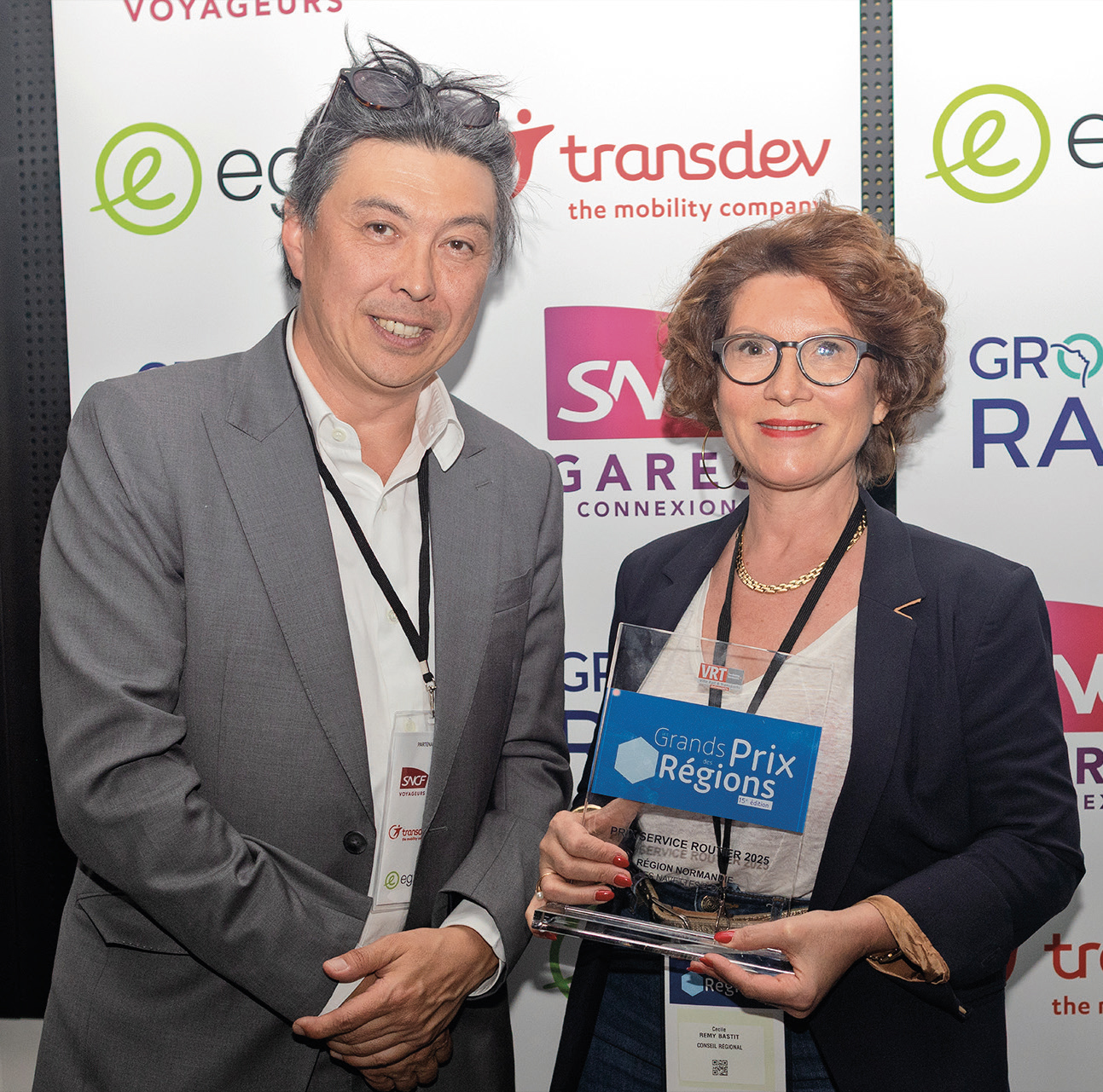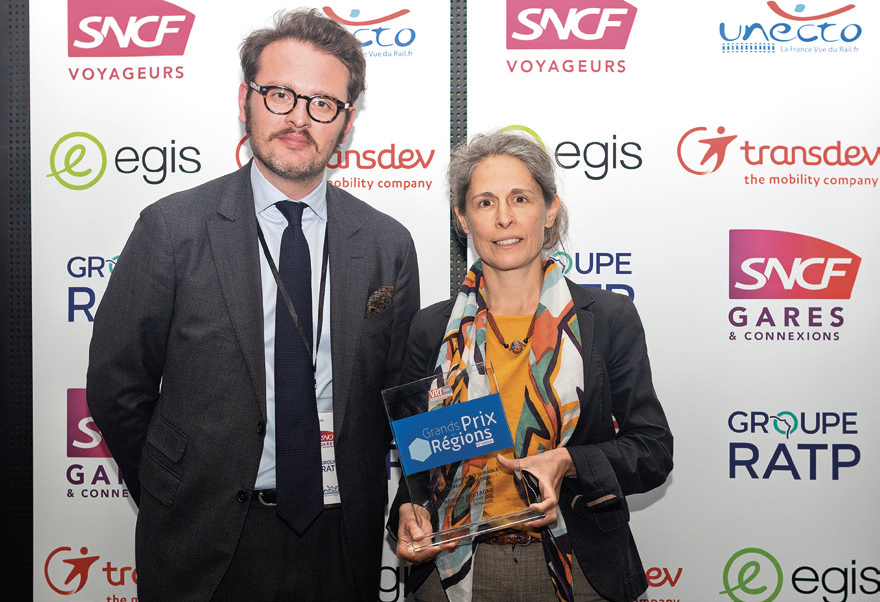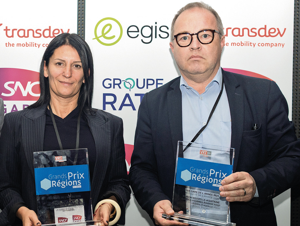 Renaud Lagrave, vice-président en charge des mobilités pour la région Nouvelle-Aquitaine et Eliane Barbosa, directrice exécutive des gares parisiennes et régionales à SNCF Gares & Connexions, ont reçu ce prix.