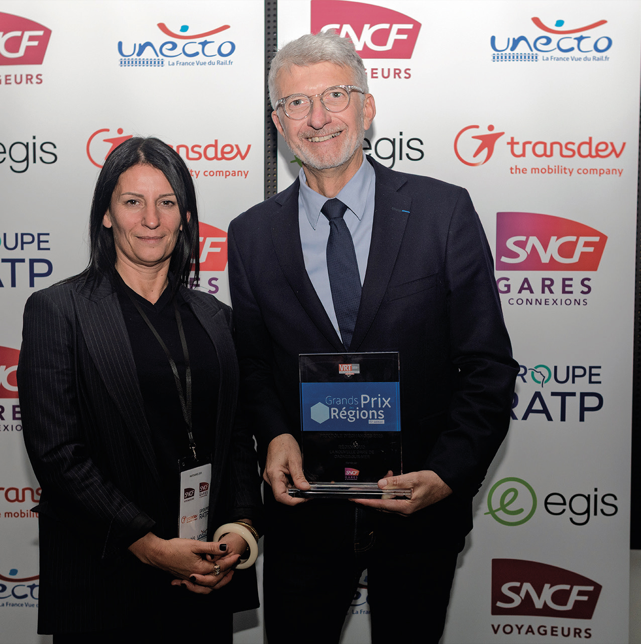Eliane Barbosa, directrice exécutive des gares parisiennes et régionales à SNCF Gares & Connexions a remis le prix à Jean-Pierre Serrus, vice-président en charge des transports et de la mobilité durable à la région Sud.