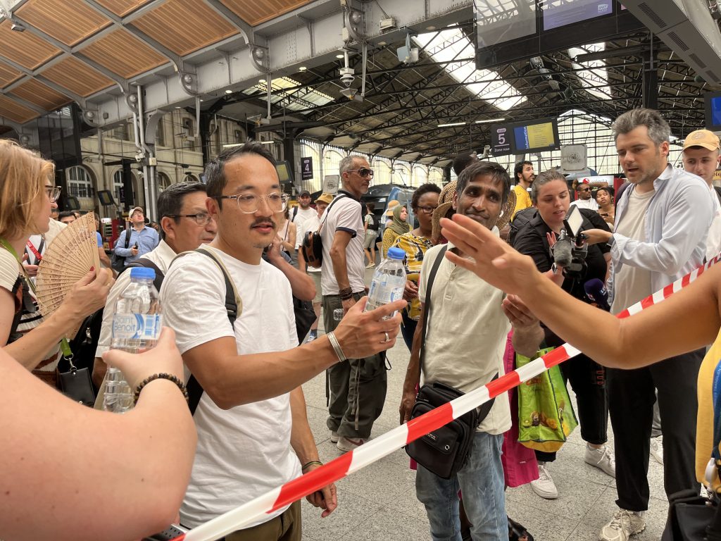 Distribution de bouteilles d’eau à la gare Saint-Lazare (comme dans une dizaine d’autres pôles d’échanges franciliens), mardi 1er juillet, alors que le trafic était interrompu et que le mercure frôlait les 39 degrés.
