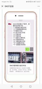 Le compte WeChat de SNCF Gares & Connexions (SNCF_France en mandarin) lancé en mars, toujours avec EuroPass, poursuit un autre objectif, celui de simplifier le passage en gare des clients chinois. Le compte s’articule autour de trois menus : « Voyager en France », « Guide pratique » (comment acheter un billet, sélectionner le bon tarif, renseignements sur les trains disponibles) et « Services et offres en gare ». Il s’appuie sur une vingtaine de gares : les six parisiennes, celles de l’aéroport CDG 2-TGV, Versailles, Chantilly, Strasbourg, Colmar, Lyon Part-Dieu, Dijon, Marseille, Aix-en-Provence, Nice et Bordeaux St-Jean.Alexandre Viros, directeur de OUI.sncf, confiait récemment devant la presse que le site de réservation de la SNCF envisageait également d’être présent sur WeChat et de collaborer avec des plateformes chinoises de booking comme la hongkongaise Klook, Fliggy, filiale voyage d’Alibaba, ou Trip (ex-CTrip).