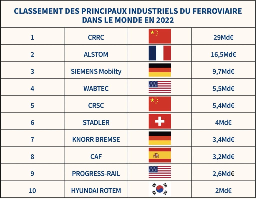 Si l’on prend ainsi le cas de la Chine, celle-ci s’appuie, pour atteindre les objectifs ferroviaires très ambitieux (mais crédibles) de Made in China 2025, sur un écosystème national contrôlé par l’État et articulé autour de l’opérateur national, China Railway (100 md€ de CA en 2022), et des grands industriels ferroviaires publics, au premier rang desquels le constructeur ferroviaire numéro un mondial CRRC (29 md € de CA en 2022) et aussi des leaders nationaux dans la signalisation ou l’infrastructure ferroviaire (CRSC : 5,4 mds€ de CA en 2022, CREC 140 md€ de CA en 2022).