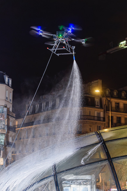La RATP a expérimenté, le 10 octobre, une nouvelle manière de nettoyer la verrière en forme de lentille qui couvre l’entrée de la station de métro sur le parvis de la gare Saint-Lazare à Paris : l’opération a été effectuée à l’aide d’un drone, en soirée, pendant l’interruption du service de manière à ne pas perturber les accès au métro et à limiter les risques d’accidents.