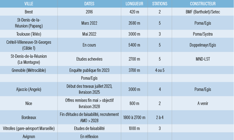 Outre les trois téléphériques en service, plusieurs collectivités et autorités organisatrices ont lancé leurs propres projets comme Angelo à Ajaccio, Câble 1 à Créteil-Villeneuve-St-Georges, La Montagne à St-Denis-de-La-Réunion. Nice a lancé un appel d’offres tandis que Grenoble, Bordeaux ou encore Marseille/Vitrolles avancent dans la démarche. Pour chaque appel d’offres, qui se présente le plus souvent sous la forme d’un contrat global (marché global de performance ou CREM, conception-réalisation-exploitation-maintenance), des groupements de fait s’organisent autour d’un spécialiste du câble issu du monde de la montagne, avec un cabinet d’ingénierie spécialisé dans l’urbain (comme Systra ou Egis…) et une entreprise de génie civil (Bouygues, Vinci, Eiffage…).