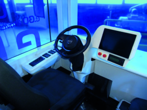 A en croire les ingénieurs de ZF, le maniement de ce levier, passée la nécessaire période d’adaptation, se révélerait beaucoup plus intuitif, précis et ergonomique que les commandes traditionnelles. Il est monté en position centrale, permettant au chauffeur, lors d’une reprise en mode manuel, de pouvoir conduire indifféremment en place gauche ou en place droite. Une telle disposition présente, en outre, l’avantage d’éviter de facto d’avoir à développer une version spécifique aux pays à conduite à gauche. Toutes les fonctions dites « secondaires », comme les clignotants, l’avertisseur sonore ou les essuie-glaces, peuvent être activées de n’importe quelle place, grâce à un unique écran tactile positionné au centre de l’habitacle. De part et d’autre de celui-ci, deux autres écrans permettent l’affichage des principales données de conduite, ainsi que la planification et l’exécution de tâches indépendantes de la circulation du véhicule.
