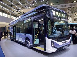 Sur le stand d’Iveco, tous les véhicules exposés appartenaient déjà à la catégorie « zéro émission ». À commencer par le Crossway Low Entry électrique en classe II, prééquipé « ceintures de sécurité » . C’est l’un des atouts de ce modèle, qui fait le lien naturel entre les deux classes. De toute manière, le Crossway reste toujours le best-seller de sa catégorie, et le cap des 60 000 exemplaires devrait être franchi avant la fin de cette année. Cela dit, le véhicule qui concentrait tous les regards était, sans conteste, le prototype d’autobus à hydrogène, dont les résultats se révèlent dès à présent particulièrement satisfaisants. Il est équipé de batteries NMC Hyundai légèrement surdimensionnées en puissance pour réduire la capacité embarquée. La solution originale développée par Iveco se situe à mi-chemin entre le « full power », où la traction est gérée par l’hydrogène, et le « range extender », où seules les batteries alimentent, en mode nominal, la motorisation électrique, l’hydrogène n’étant alors mis à profit qu’en tant que prolongateur d’autonomie. En fait, sur le prototype d’Iveco, on n’utilise la pile à combustible qu’à 60 % de sa puissance maximale. Ainsi, l’énergie qui arrive à la motorisation provient tout à la fois de la pile et des batteries. Cela permet de réduire le volume de batteries embarquées, et donc le poids du véhicule. Le démarrage peut s’effectuer en « pur électrique », puis la pile va s’allumer pour fournir de l’énergie tant aux batteries qu’à la motorisation. Des stratégies d’urgence existent en cas d’apparition d’un défaut affectant la pile ou les batteries. Les composants dialoguent entre eux, et c’est cette intégration qui, en réalité, fait toute la différence avec les autres solutions. Le choix technique d’Iveco permet ainsi d’emporter jusqu’à 112 voyageurs, tout en garantissant une autonomie supérieure à 400 km. « Sur un autobus 100 % électrique, il faut toujours choisir entre transporter des passagers ou transporter des batteries, rappelle Alessandro Giuliani, responsable Marketing produit bus chez Iveco. Mais avec notre solution hydrogène, le véhicule s’adapte à la ligne et même au moment de la journée, et l’exploitant gère son parc à sa façon, beaucoup plus finement. » En début de service, batteries et réservoirs d’hydrogène sont chargés à 100 %. On peut alors rouler sur quelque 50 km en « pur électrique ».