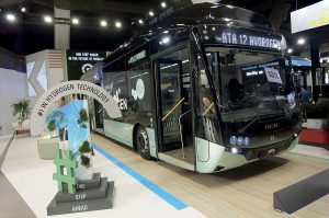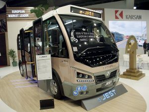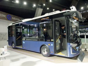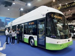 Très en pointe dans le domaine de la conduite autonome, le constructeur turc Karsan présentait son midibus électrique e-Atak de 8 m, en service commercial à Stavanger, en Norvège, depuis 2022, avec un degré d’automatisation de niveau 4 (GoA4). Il s’agit indiscutablement d’une première mondiale. Karsan exposait également son minibus électrique e-Jest de 5,80 m, ainsi que son autobus standard de 12 m e-Ata à hydrogène. Ce modèle est équipé d’une pile à combustible d’une puissance de 70 kW et de batteries LTO d’une capacité de 30 kWh. « À la fin de cette année, nous roulerons dans 22 pays, avec un total de 1 000 véhicules électriques », se félicite déjà Okan Bas, président de Karsan.