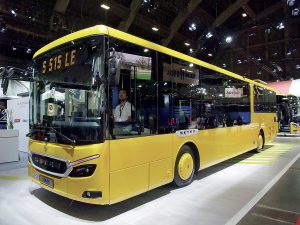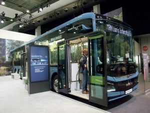 Sur le stand du constructeur allemand Mercedes, outre l’eCitaro 100 % électrique désormais bien connu, trônait le nouvel eCitaro fuel cell à hydrogène. Il est équipé d’une pile à combustible Toyota de deuxième génération, d’une puissance maximale de 60 kW, de trois packs-batteries NMC3 d’une puissance unitaire de 98 kWh, et de cinq réservoirs d’hydrogène en toiture. Cet autobus entre dans la catégorie « range-extender », où la pile est utilisée comme prolongateur d’autonomie. Dans la gamme Setra, la nouvelle MultiClass 500 était représentée par l’autocar interurbain « low entry » en version « mild-hybrid » S 515 LE Hybrid.