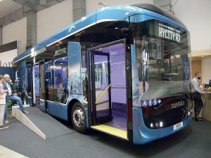 Le Hycity de Safra dévoiléLe seul constructeur 100 % français d’autobus à hydrogène avait choisi Busworld pour dévoiler son tout nouvel autobus Hycity de 12 m, dont il va livrer dix unités à Keolis pour son réseau de Clermont-Ferrand en milieu d’année prochaine. Safra avait déjà remporté, cet été, l’appel d’offres du réseau de Dunkerque, exploité par Transdev, pour dix autres véhicules similaires. L’Hycity intègre une pile à combustible française d’une puissance maximale de 45 kW – pour une puissance utile de 30 kW – développée et commercialisée par Symbio, entreprise cofondée par Michelin et Faurecia. La chaîne de traction du Hycity se compose également d’une batterie NMC de 30 kW, d’une capacité de 130 kWh, et d’un essieu motorisé avec deux moteurs de 125 kW chacun. Le nouveau véhicule embarque 35 kg d’hydrogène dans six réservoirs Plastic Omnium de type 4 positionnés en toiture. Il est du type « full power », puisque la totalité de l’énergie utilisée pour la traction provient de l’hydrogène, si bien que sa batterie ne nécessite pas de recharge nocturne en dépôt.