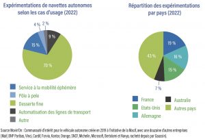 Les expérimentations dans le monde428 expérimentations de navettes autonomes ont été menées dans le monde, dont 65 % en Europe et 19 % en France. Moins d’un tiers de services ont été testés en territoire rural. Les cas d’usage les plus fréquents sont des dessertes fines privées : entreprises, campus, aéroports), des sites publics en ville et dans le périurbain (zones piétonnes, quartiers) mais aussi la desserte du premier et dernier kilomètre, vers des hubs de mobilité.