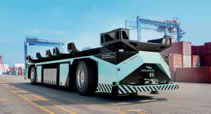 Le véhicule autonome de transport de conteneurs portuaires concu par l’entreprise Gaussin qui a racheté Navya en 2023. Transport autonome de marchandises