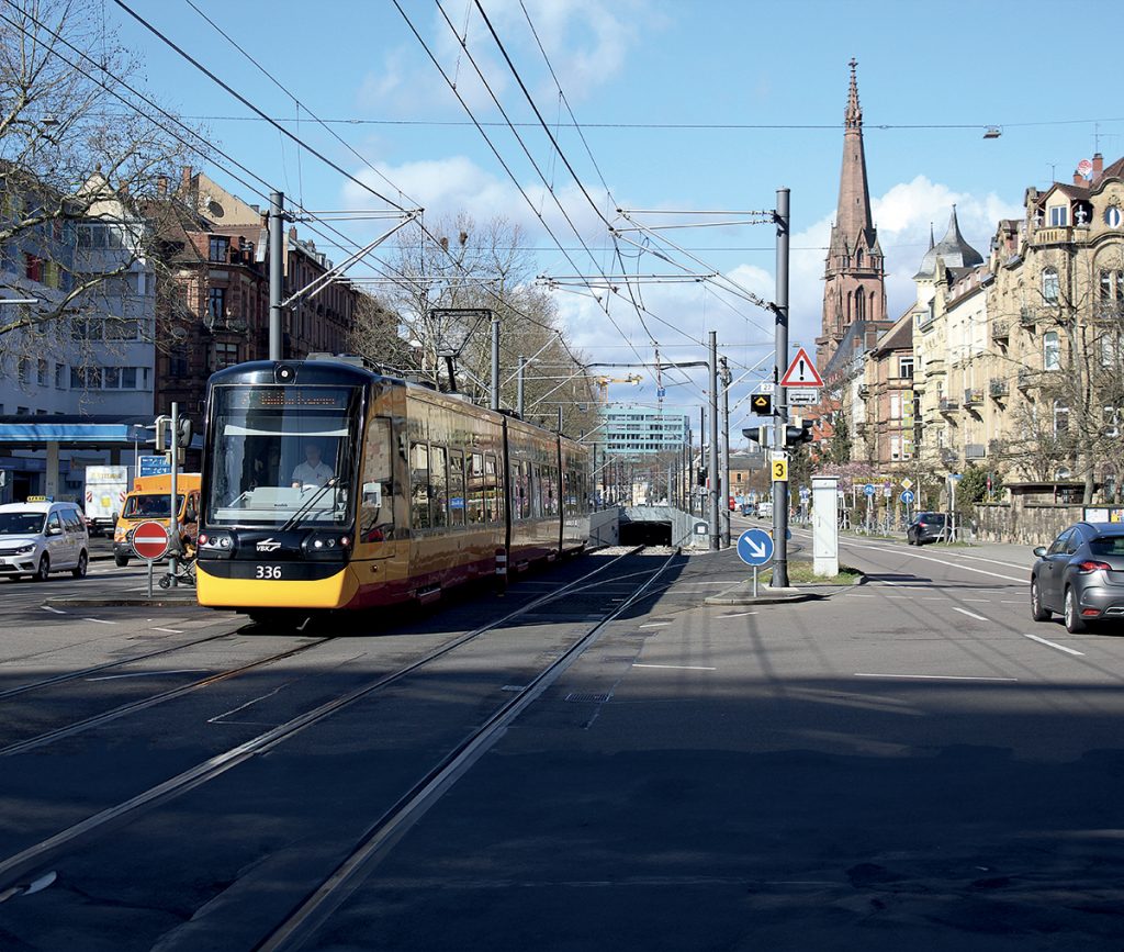 Nulle part ailleurs, le concept du tram-train, inventé dans cette ville du Bade-Wurtemberg, n’aura été mis à profit de façon aussi aboutie. Victime de son succès, le tram de Karlsruhe devait impérativement accomplir un saut quantique pour pérenniser son expansion. D’où l’achèvement, après douze ans de travaux, d’un projet pharaonique – à l’échelle de la cité – de 1,5 milliard d’euros, pour enterrer ses voies en centre-ville.La Kaiserstrasse (rue de l’Empereur) n’est plus, désormais, le royaume des tramways. Pendant des décennies, cette voie piétonne, emblématique du centre de Karlsruhe, fut le théâtre d’un défilé ininterrompu de trams urbains ainsi que de trams-trains. Les voyageurs y trouvaient leur compte, puisque cette véritable desserte « de porte à porte » de l’artère la plus animée de la ville leur permettait d’arriver au plus près des bureaux et commerces où ils se rendaient. Cependant, plus d’un riverain ou d’un passant déplorait la relative difficulté, aux heures de pointe, de traverser la chaussée, fustigeant ce qu’ils appelaient le « mur jaune », formé par les rames de cette couleur se suivant les unes derrière les autres en procession quasi-ininterrompue.