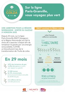 Dans l’objectif de décarbonation des modes de transport sont expérimentés depuis 2021 des trains utilisant  le biocarburant B100, sur la ligne Paris – Granville. Le bilan de cette expérimentation étant positif, la Normandie a pérennisé ce dispositif jusqu’en 2033.
