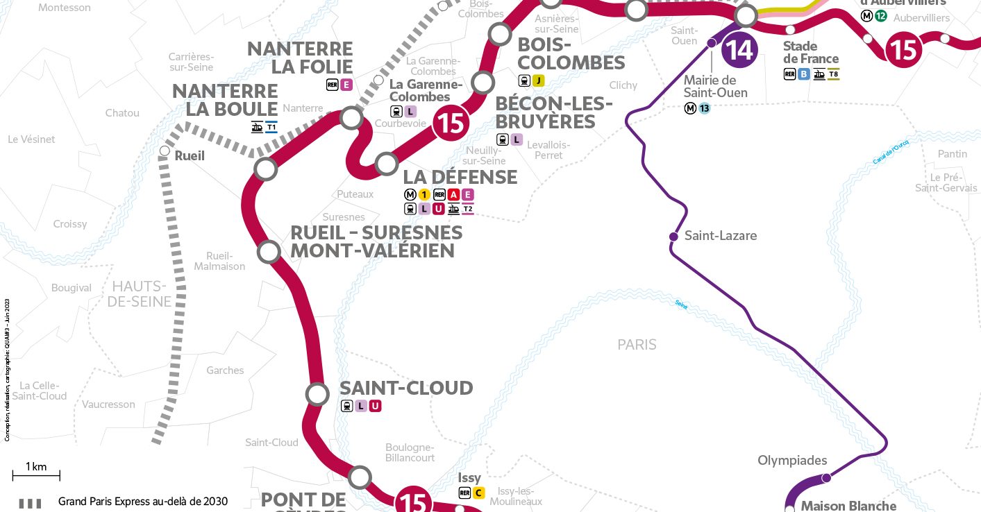 Prolongement vers le nord le tronçon Sud de la ligne 15, cette première partie du tronçon Ouest de la ligne 15 sera en correspondance avec les lignes Transilien L et U à Saint-Cloud, avec le RER E à Nanterre La Folie, ainsi qu’avec les lignes A et E du RER, la ligne 1 du métro, le T2 du tramway et les lignes Transilien L et U à La Défense. La mise en service de ce premier tronçon est prévue pour fin 2031 et le montant global du marché s’élève à 2,71 milliards d’euros, « dont 20 % seront confiés à des PME locales », selon la SGP et Vinci. Ce contrat porte sur la construction tous corps d’état de 14 km de tunnels, de cinq gares (Saint-Cloud, Rueil – Suresnes – Mont-Valérien, Nanterre La Boule, Nanterre La Folie et La Défense), d’une arrière-gare à Nanterre La Folie et de 16 ouvrages de service.