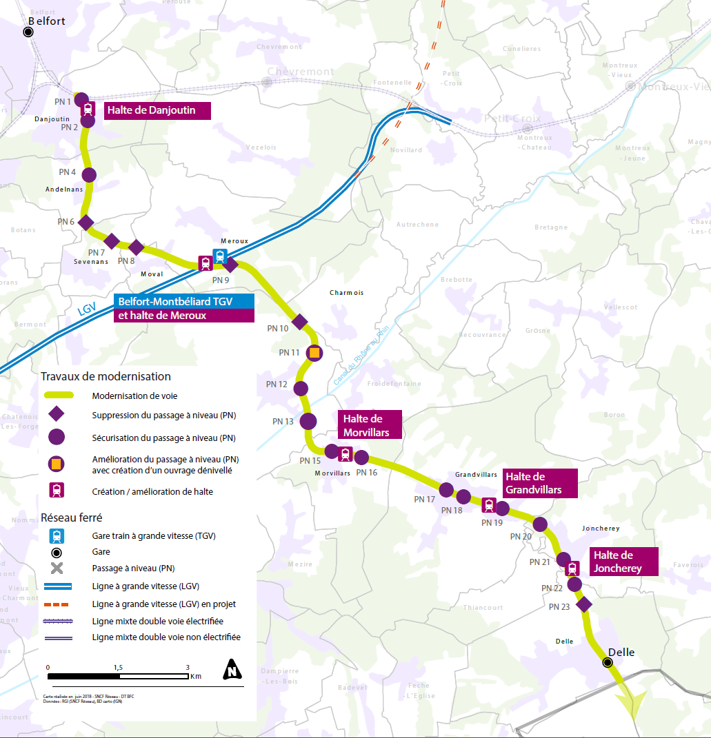 Finalement, les travaux de reconstruction de la ligne ont été lancés en 2015. Non seulement la voie unique a été reposée, mais son tracé a été dévié au niveau du franchissement de la LGV Rhin-Rhône, dont la construction avait littéralement coupé en deux l’ancienne ligne (où une desserte fret s’était jusque-là maintenue). Sur la ligne reconstruite, un point d’arrêt TER facilitant la correspondance avec la gare TGV (ouverte en 2011) a donc été établi. Au total, cinq arrêts ont été créés ou recréés sur le tracé rouvert, sans compter Belfort et Delle. Cette dernière gare est toutefois passée à trois voies, les systèmes d’électrification n’étant pas les mêmes de part et d’autre de la frontière. En effet, c’est sous caténaire 25 kV 50 Hz française que la ligne a été rouverte en 2018 (au-delà, du côté suisse, la caténaire 15 kV 16,7 Hz est arrivée dès 1933).