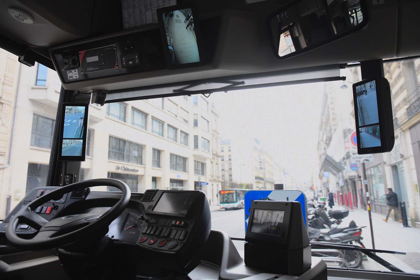 L’accent a été mis tout particulièrement sur la sécurité, l’accessibilité, l’information et le confort. Côté sécurité, c’est la fin des rétroviseurs avec leurs angles morts si redoutables pour les deux roues. Des écrans vidéos à droite et à gauche du conducteur renvoient des images qui offrent une vision en profondeur de l’environnement du bus. Le machiniste pourra voir le petit enfant devant son pare-chocs, tout comme le cycliste imprudent qui tente un dépassement à droite.