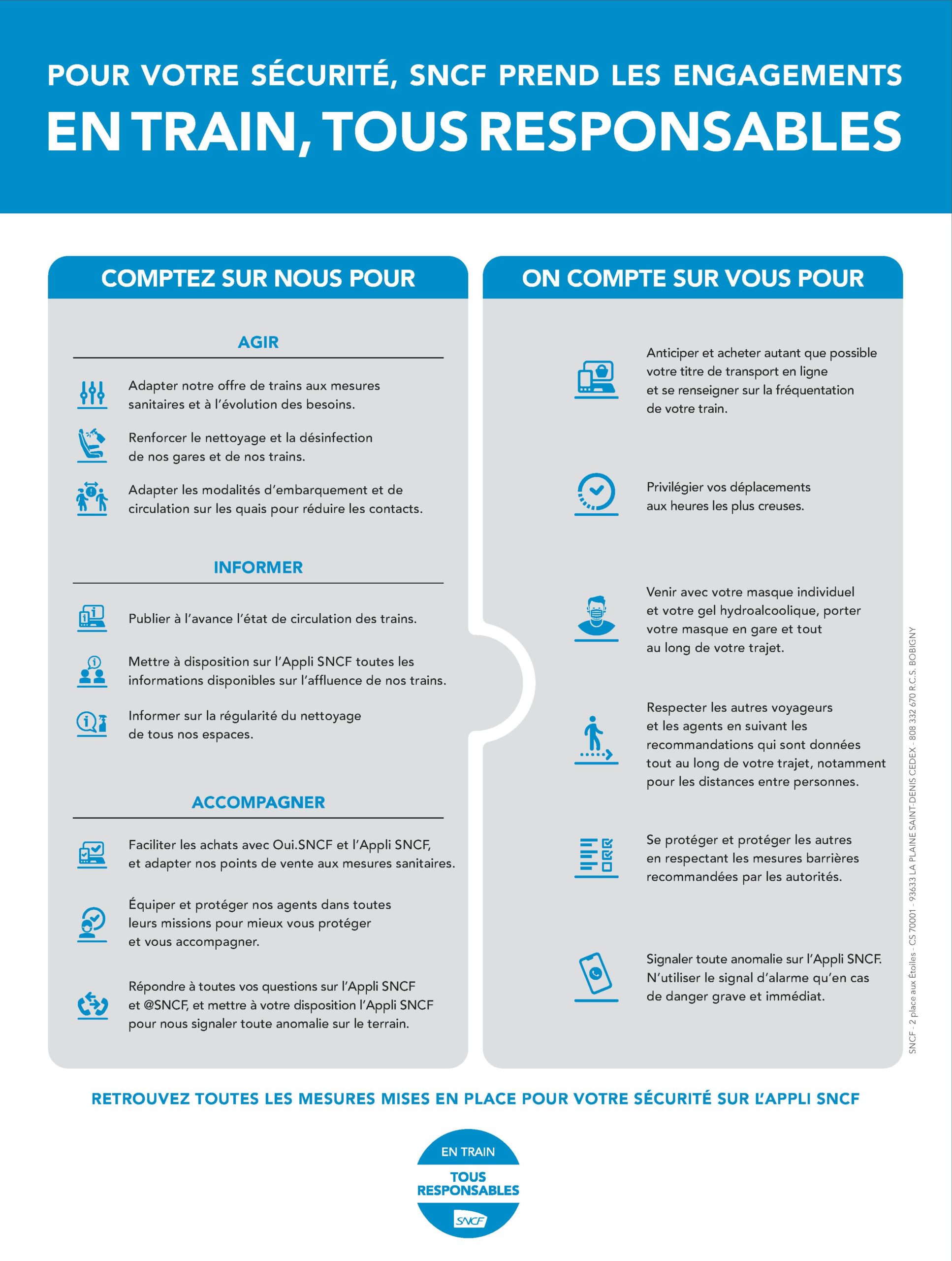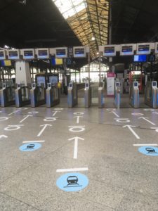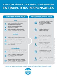 Les initiatives se multiplient pour maintenir les distances entre les voyageurs et éviter qu’ils ne se croisent non seulement à bord des trains mais aussi dans les halls d’accueil et les quais des gares. Pour matérialiser les distances à respecter, les opérateurs ont recours à des marquages au sol et à des stickers pour condamner une place sur deux dans les trains. « 1,5 million de stickers ont posé en quelques jours », a indiqué le 9 mai Christophe Fanichet, PDG de SNCF Voyageurs. Mais, a-t-il ajouté, « nous avons aussi besoin que les voyageurs nous aident ». La SNCF a ainsi édicté une charte voyageurs, présentée aux régions et aux associations d’usagers et baptisée En train tous responsables.