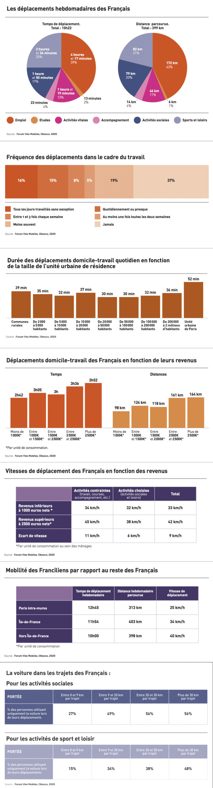 L’Enquête nationale mobilité et modes de vie 2020, réalisée par le Forum Vies Mobiles, fait apparaître un nouveau visage de la mobilité des Français. En moyenne, dans le monde d’avant le Coronavirus, un Français se déplaçait 10 heures par semaine et parcourait 400 kilomètres. Nettement plus que ce qu’on mesurait. Principale raison de la différence : en plus des déplacements domicile-travail, le Forum Vies Mobiles tient pleinement compte de la mobilité dans l’exercice même des métiers. Un changement de perspective qui conduit à des préconisations ciblées pour réussir la transition énergétique…