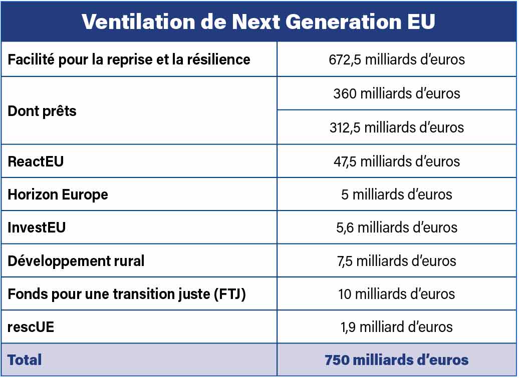 Doté d’un montant global de 750 milliards d’euros dont 390 milliards d’euros de subventions (les 360 milliards restants intervenant sous forme de garanties et de prêts), il intervient pour renforcer la transition verte et numérique et la résilience des économies nationales (voir tableau ci-dessous).