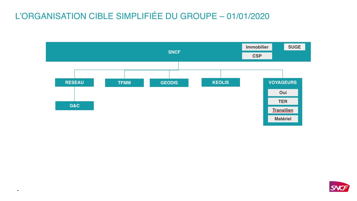 Une quatrième société anonyme prendra le nom de SNCF Voyageurs et rassemblera les activités de TGV, d’Intercités, de TER et de Transilien. Avant même la publication des ordonnances sur la nouvelle gouvernance du groupe public ferroviaire, la direction de la SNCF a programmé la fin de l’éphémère SNCF Mobilités qui coiffait jusqu’alors Keolis, Geodis et Fret SNCF. « Ainsi, on sait exactement qui fait quoi et on disposera d’une vision claire sur les missions de chaque SA. C’en est donc fini des trois Epic qui sont interdépendants », commente Guillaume Pepy.