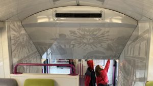 Une décoration intérieure inspirée par Versailles dans cette rame Z 20900 de la ligne V. Une particularité de cette nouvelle desserte est de favoriser l’usage du vélo afin de faciliter le tourisme vert dans la vallée de la Bièvre : c’est pourquoi l’accès de ces deux roues à bord des trains est autorisé durant toute la journée (alors que, dans les autres transports en commun d’Ile-de-France, l’usage de la bicyclette n’est autorisé qu’en dehors des heures de pointe). De plus, dans les gares, des informations culturelles et patrimoniales sont proposées aux voyageurs par SNCF Gares & Connexions, alors que le pelliculage intérieur des rames présente les sites remarquables. En dépit de ces efforts de communication, un petit détail trahit une certaine improvisation dans la création de la ligne V : sur tous les affichages dynamiques en gare, les trains de la nouvelle ligne sont toujours présentés comme assurant une desserte du RER C !