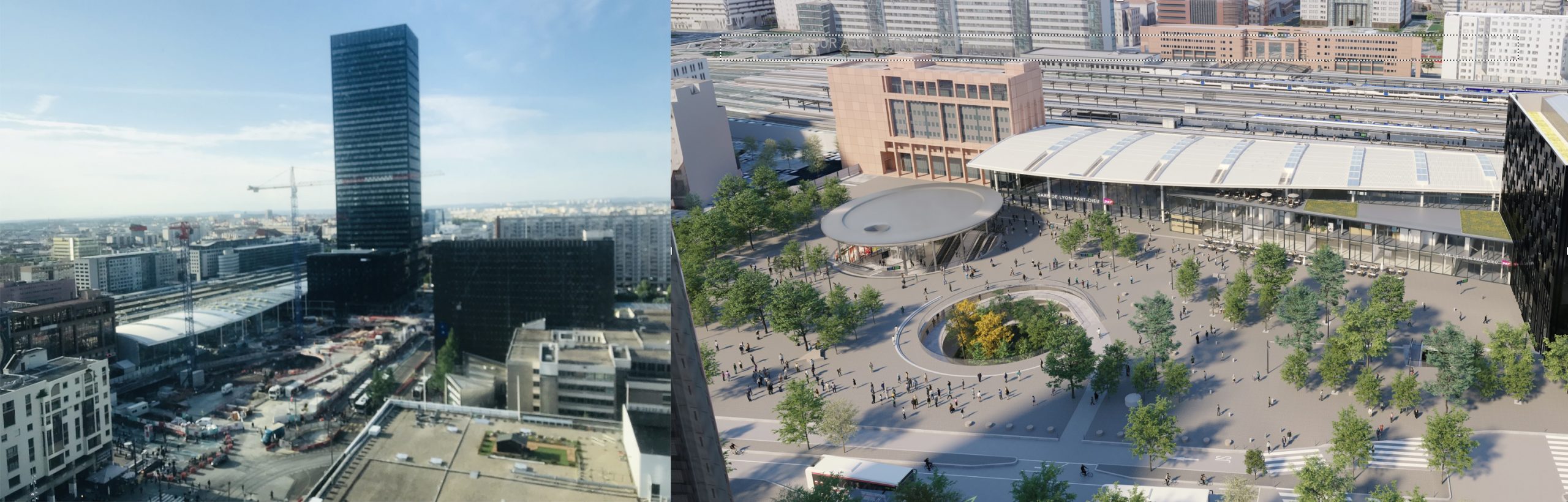 A Lyon, La Part-Dieu ressemble aujourd’hui à tout sauf à une gare, tant le chantier est spectaculaire (photo avant-après), rattrapé par un vaste projet de rénovation urbaine du quartier d’affaires autour de la gare vouée à devenir un pôle d’échanges multimodal. Construite au début des années 80, la deuxième gare la plus fréquentée de France (en dehors des parisiennes), est sous-dimensionnée et saturée depuis les années 2010. Les travaux ont démarré en 2017 et s’étalent en plusieurs étapes jusqu’en 2030 pour doubler les surfaces et tripler les flux de voyageurs, sur trois niveaux. « Une machine à circuler« , commente Frédéric Longchamp qui dirige les opérations de transformation. Montant total du projet : 213 millions d’euros.Commerces et péages
