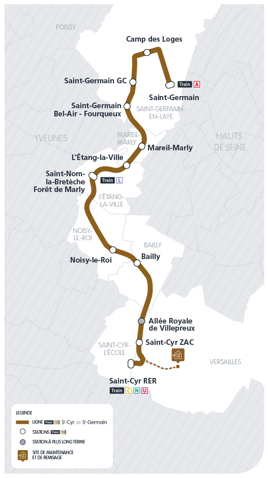 Le T13 d’un coût de 306 M€ permettra de parcourir les 18,8 km entre Saint-Cyr et Saint-Germain en une demi-heure, avec une fréquence de 10 minutes aux heures de pointe. La première rame Alstom Dualis est attendue au centre de maintenance de Versailles-Matelots en mai 2020, quelques semaines avant les premiers essais en ligne. A l’horizon 2026, le T13 sera prolongé vers la gare d’Achères depuis Saint-Germain-Grande-Ceinture.