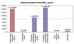 Voici comment on arrive à un montant annuel de l’ordre de 14 milliards. Si l’on ajoute des externalités chiffrables comme la circulation automobile induite, les émissions de gaz à effet de serre liées au stationnement public (environ 10,3 millions de tonnes), la congestion, l’usure des routes, la pollution, les accidents et le bruit, il faut ajouter environ 10,8 milliards d’euros. Si l’on déduit les recettes publiques liées à la circulation (TICPE, principalement), le coût net est d’environ 7,9 milliard d’euros. Et encore, « le coût du foncier routier, l’impact sur les autres modes de déplacement, l’environnement ou sur la santé n’a pas été monetarisé », ajoute Bruno Cordier.
