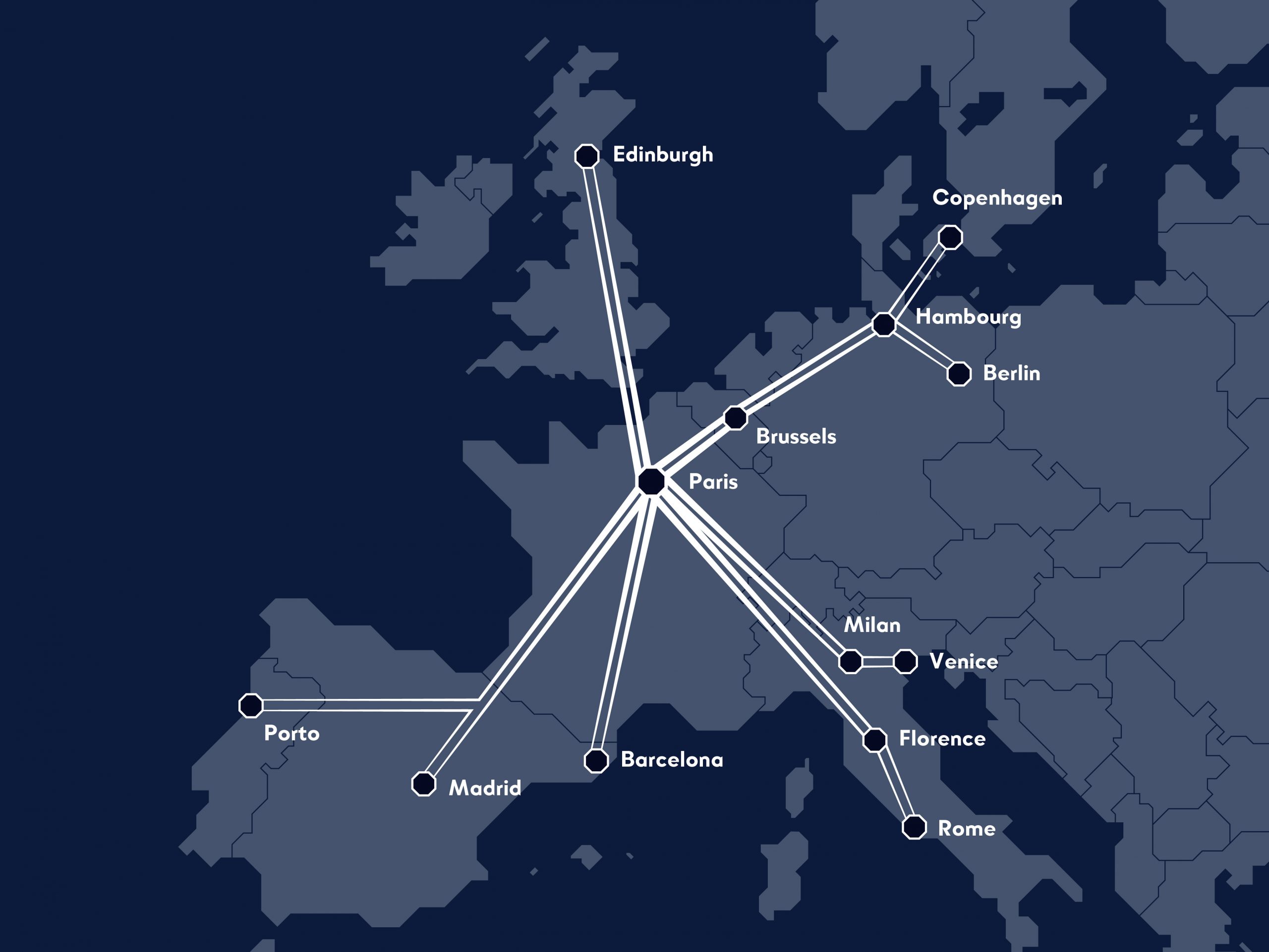 Réseau envisagé par Midnight Trains Si l’on veut vraiment apporter une alternative durable à l’avion sur des distances de 800 à 1 500 km, le train de nuit permet de proposer des horaires convenables, avec des heures d’arrivée permettant de passer une journée de plus à destination, tout en se passant de réserver une nuit d’hôtel supplémentaire. « Nous visons de gros marchés, avec 1,5 million de voyageurs aériens par an, et pensons proposer très peu de cabotage », précise Adrien Aumont. Ce principe permettrait d’atteindre en une nuit des destinations comme Madrid, Lisbonne, Porto, Milan, Venise, Florence, Rome, Vienne, Prague, Budapest, Berlin, Hambourg, Copenhague ou encore Edimbourg au départ de Paris. Mais pas toutes dès le premier jour : « nous allons commencer par une ligne », en donnant la priorité aux destinations vers lesquelles le matériel roulant le plus interopérable pourra être mis en service.